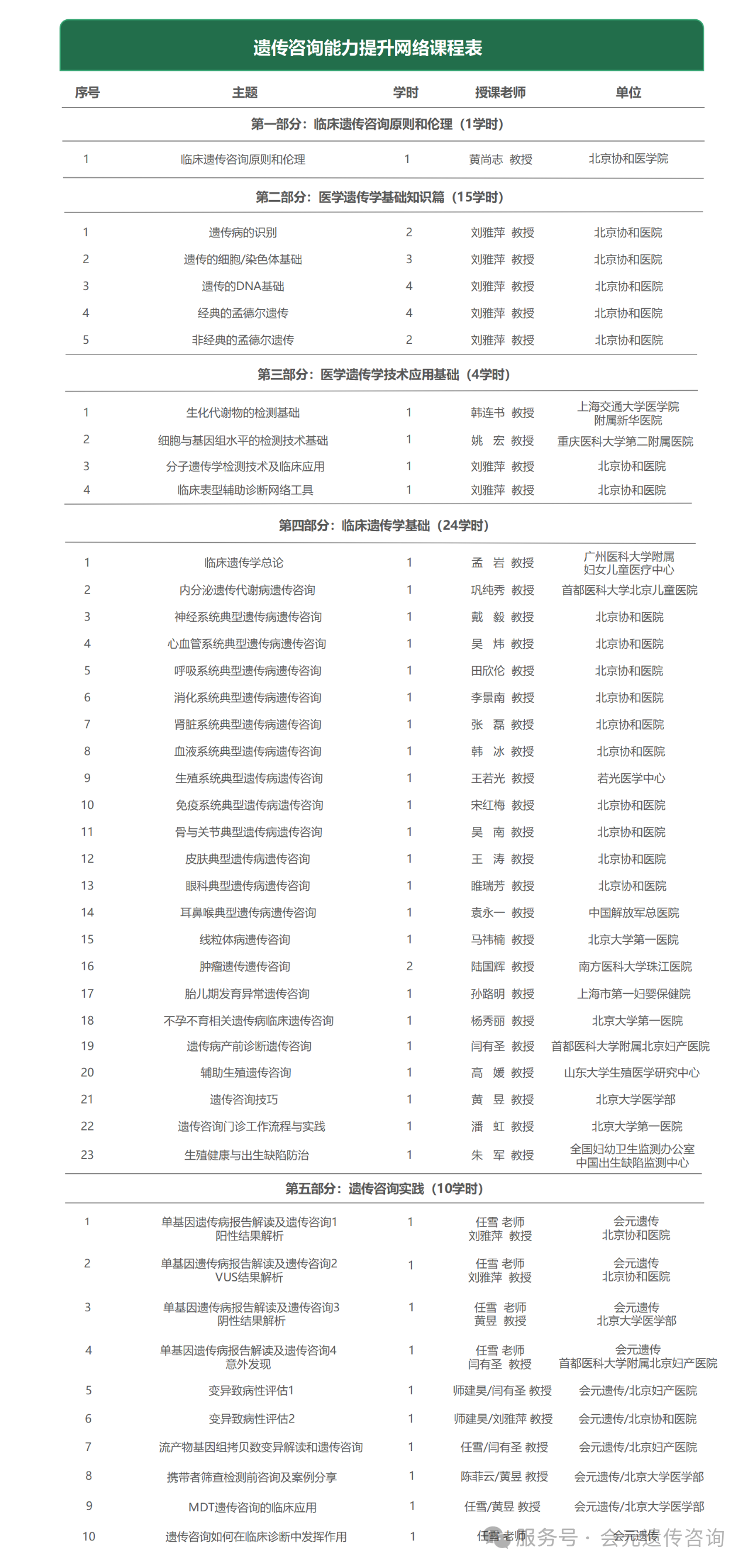 邀请30余位具有丰富实践经验和教学经验的医学遗传学、临床医学等遗传咨询专业的资深专家教授授课。