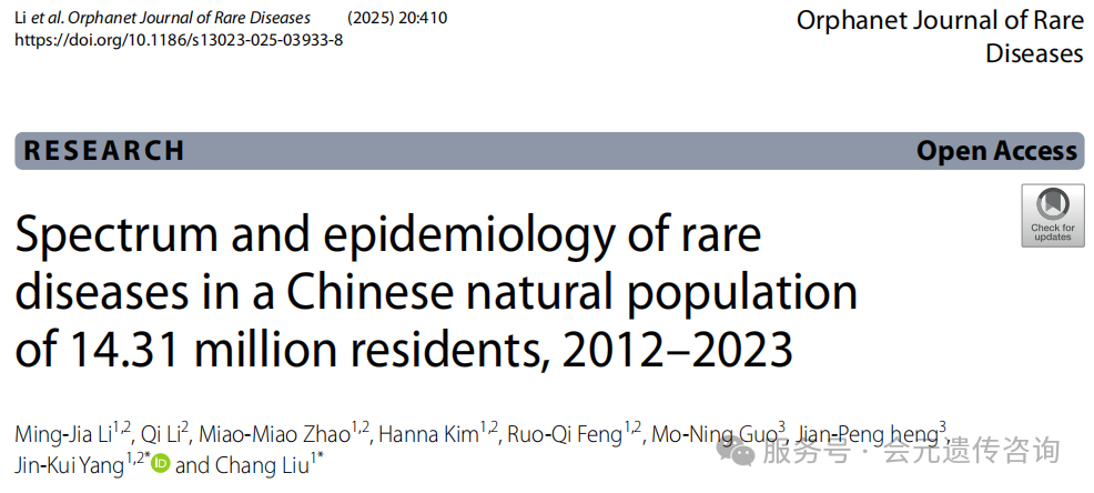 Li MJ, Li Q, Zhao MM, Kim H, Feng RQ, Guo MN, Heng JP, Yang JK, Liu C. Spectrum and epidemiology of rare diseases in a Chinese natural population of 14.31 million residents, 2012-2023. Orphanet J Rare Dis. 2025 Aug 7;20(1):410. doi: 10.1186/s13023-025-03933-8. PMID: 40775651; PMCID: PMC12333119.