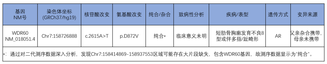 3)关于再生育的咨询:因不是临床病人的检测,而是胎儿的,临床信息不全面,也有可能很多临床表现胎儿还没有表现出来,所以目前临床诊断不明确。需要注意存在WDR60基因不是胎儿患病原因的风险,不管将来选择哪种生育方式,要知晓存在这种情况的风险。